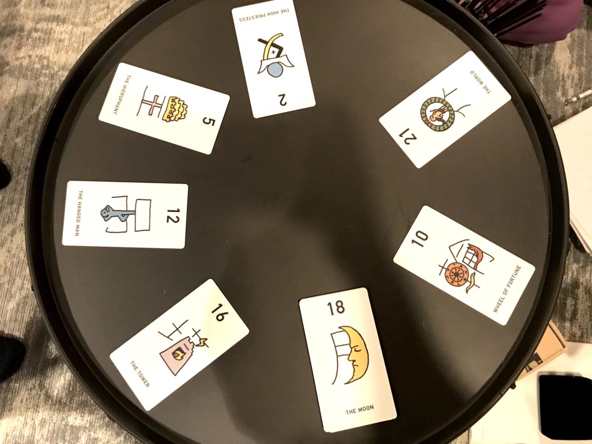 ちなみに、易を立てる順番を決めた大アルカナ1枚引きがこちら。上の2番から時計回りに、【2・女教皇】てるこ→【21・世界】ゆみこ→【10・運命の輪】ともみん→【18・月】たまき→【16・塔】あまなつ→【12・吊られた男】まる→【5・法皇】あんこ、というラインナップです。