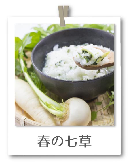 年初若菜を摘みその生命力を頂く「若菜摘み」、古代中国1月1日トリから始まる動物占い、7日目の人日の節句などが交わり、江戸時代になると一年のはじまりに無病息災を願って食されるようになった春の七草粥