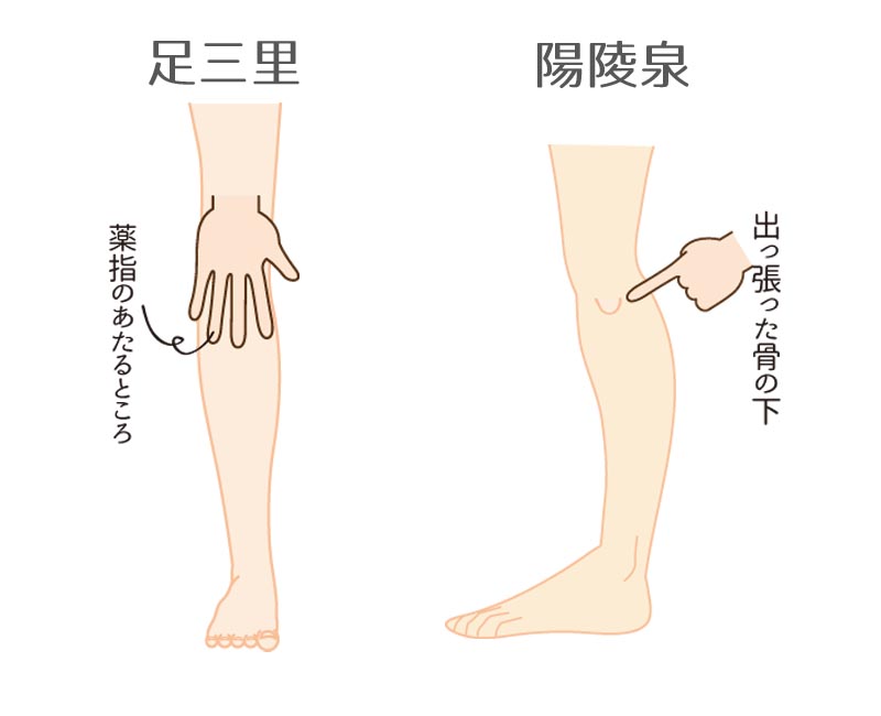 “足三里”は膝のお皿を手を広げて押さえた時に薬指が当たるところ。消化作用を助けてくれます。