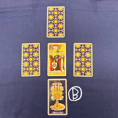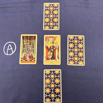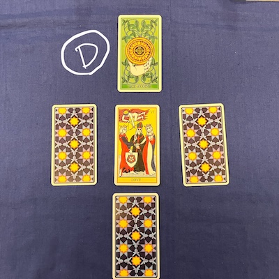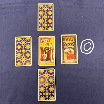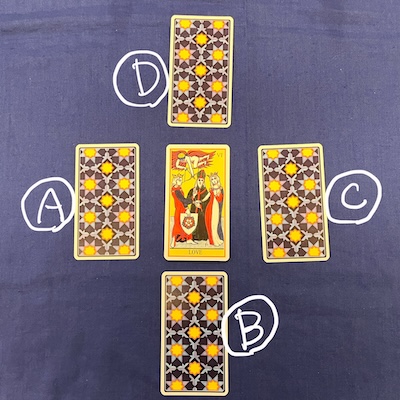 中央に鎮座するカードは、大アルカナの「恋人」です。いろんなタロットがあって、それぞれにいろんな解釈がありますが、マルセイユ版(をベースにしたデッキ)は、ふたりの女性のあいだで迷って選択を迫られている男性が描かれています。