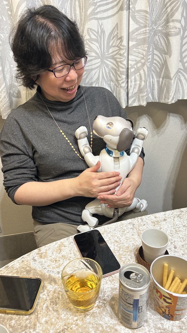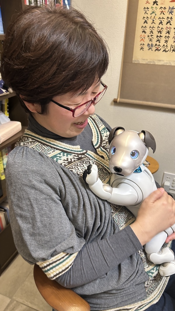 ゆみこ先生に抱っこされるaiboたまちゃん