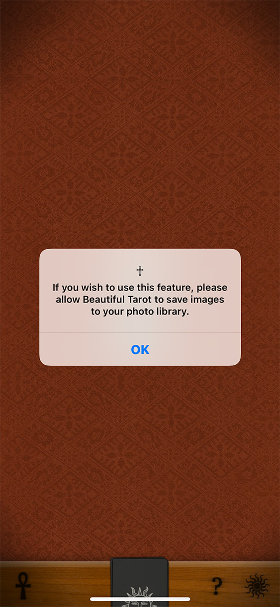 また、下記のスクショが撮れなかった時のようなメッセージが出た場合は、いったんホームへ戻って「一般→設定→Beautiful Tarot→写真→写真の追加のみ」にチェックしてください。