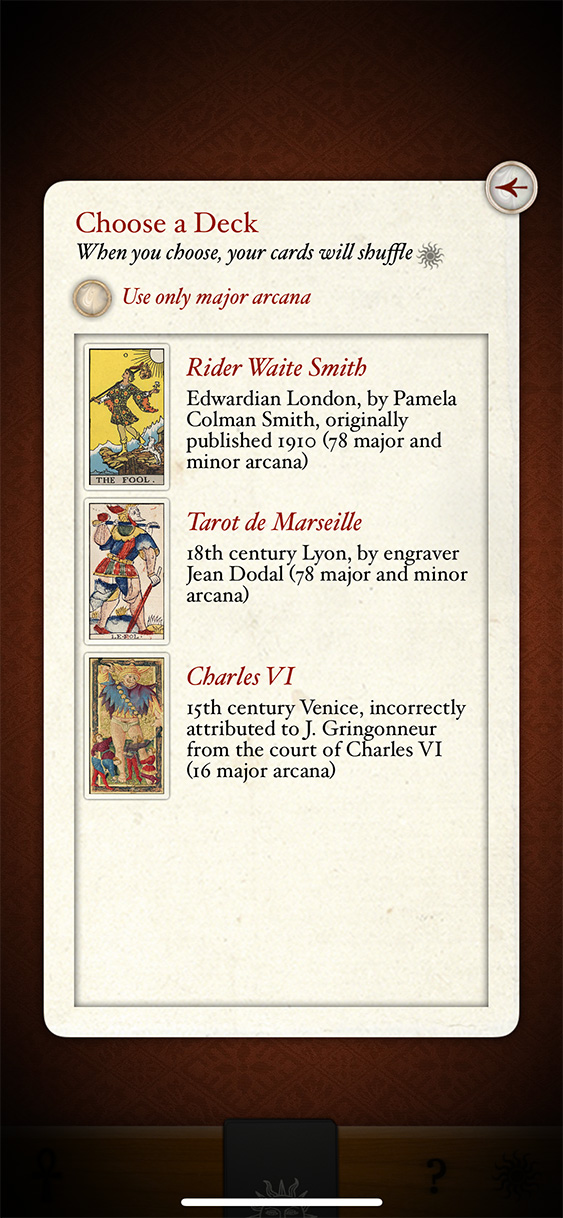 「Use only major arcana」と書かれたところをタップすると、大アルカナカードのみが使えます。