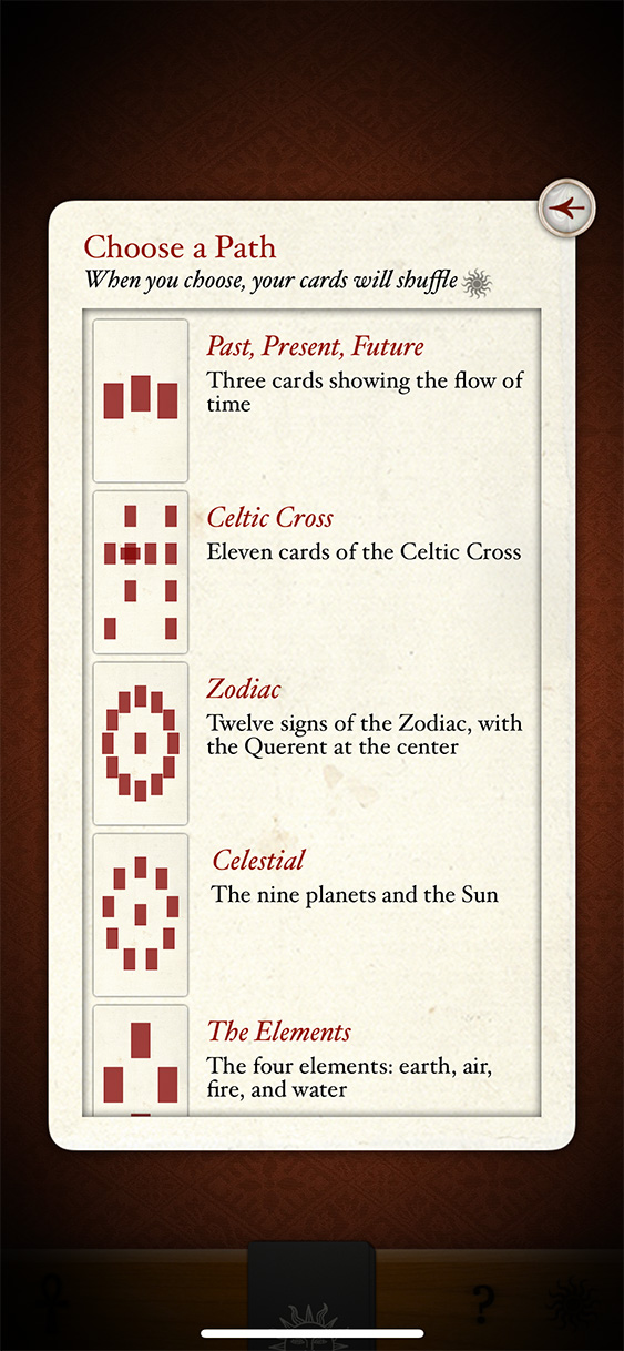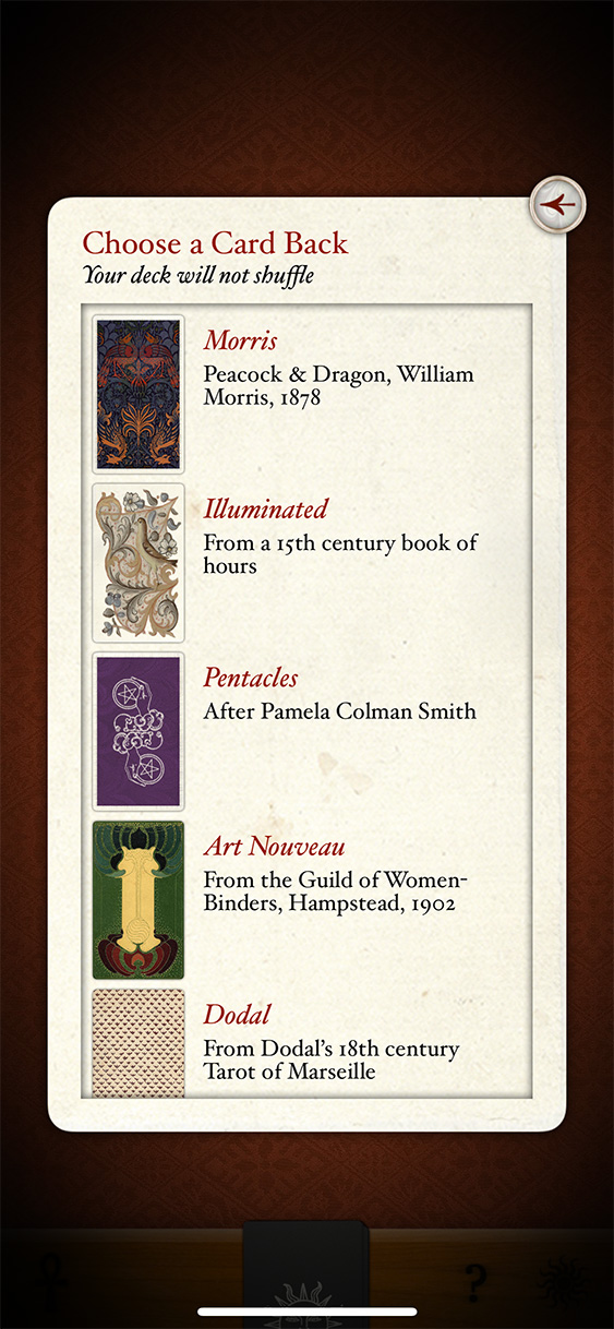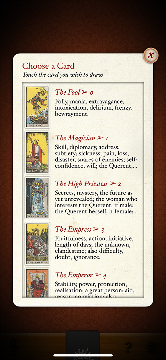 タロットクロスの部分(背景)をダブルタップすると現在使用しているデッキのカード一覧が出てきます。