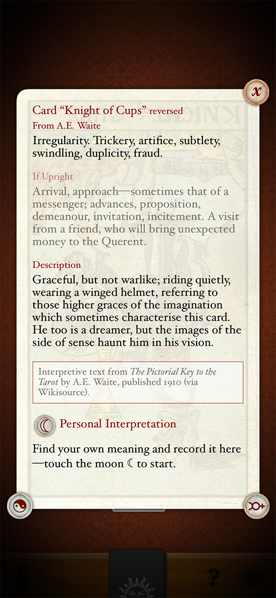 英語でカードの意味が表示されますが、自分の解釈を記入することも可能です。