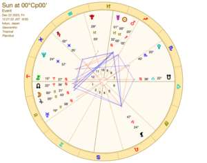 冬至図を出してみたんですが、月や木星が牡牛座にあって太陽とトラインになり、魚座土星と小三角を作っていて、おだやかな図だなと感じました。