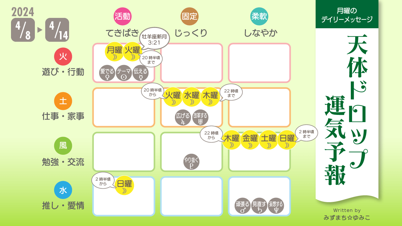 魚座でのアスペクトなので、奉仕活動や周りへの心情的な配慮、芸術活動、占いなど神秘的な活動に集中的に力を注ぐのは良いでしょう。