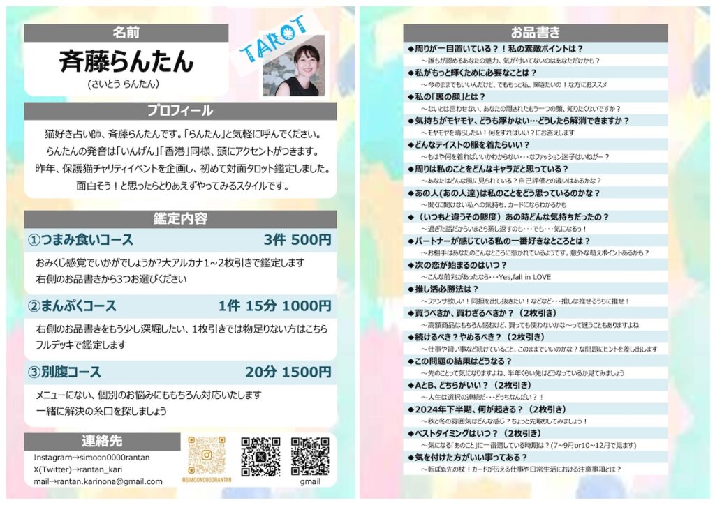 猫好き占い師、斉藤らんたんです。「らんたん」と気軽に呼んでください。らんたんの発音は「いんげん」「香港」同様、頭にアクセントがつきます。昨年、保護猫チャリティイベントを企画し、初めて対面タロット鑑定しました。 面白そう!と思ったらとりあえずやってみるスタイルです。