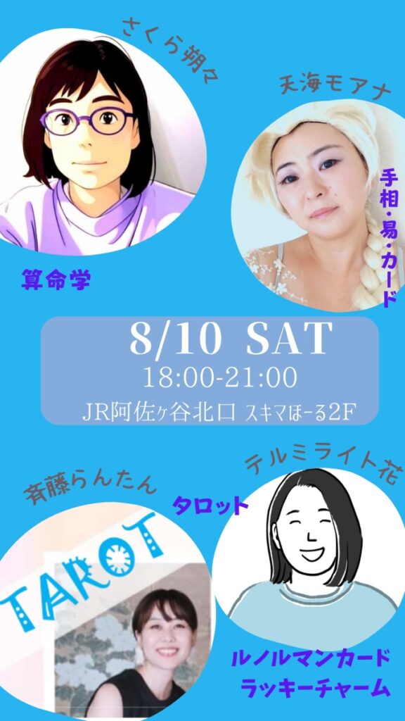子どもの頃からの占い好き。タロット・ルノルマンカード・西洋占星術をメインに、都内の占い・癒やし系イベントにて活動しています。地に足のついたアドバイスが得意。現実に憂い、迷う背中を 押す役目です。