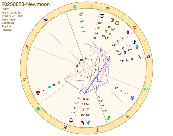 さらにこの新月は、水瓶座冥王星、牡羊座土星、海王星とそれぞれ150度をとっています。