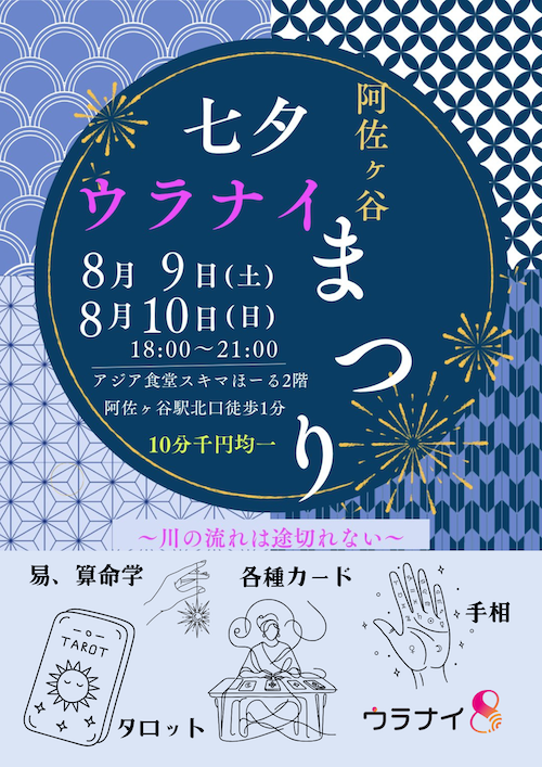 昨年に引き続いて阿佐ヶ谷七夕まつりイベントです。阿佐ヶ谷北口のアジア食堂スキマほーるの2階を貸していただいて、占いワールドが繰り広げられます。